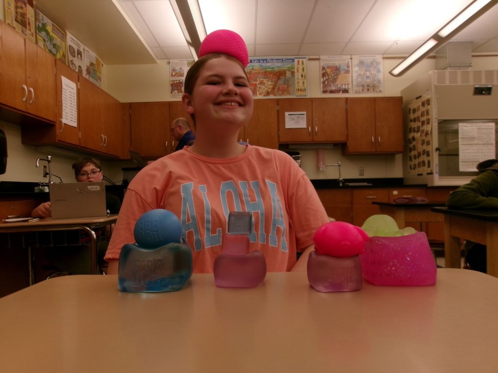 Both students and faculty at the Junior High had strong opinions about whether or not NeeDohs should be allowed in the classroom. Those in favor of having them agree they are cool because they are “fun to play with” and “so nice” according to 6th graders Addy Getty and Athena Adams. Among the selection of squishies, the favorite Needoh among the junior high is the Needoh Ice Cube. It is a cube-shaped toy filled with gel, usually in purple, pink, and blue. Lots of students agree that it helps their anxiety and relieves them of the stress that is given to them at school.